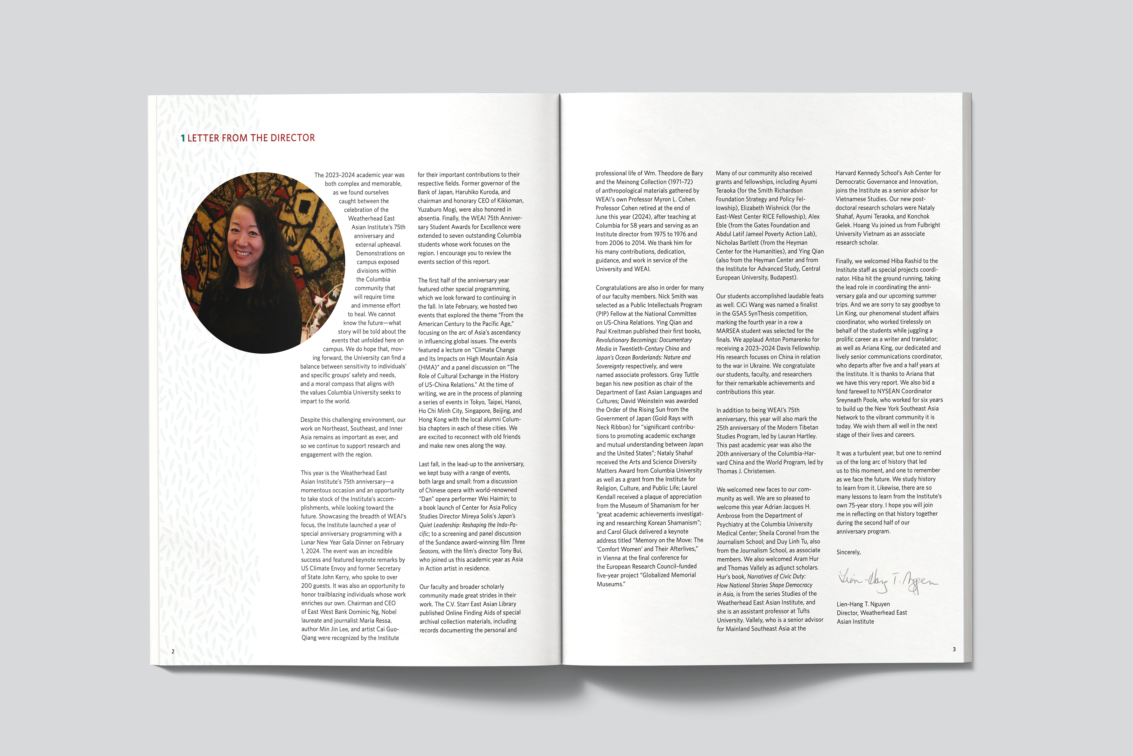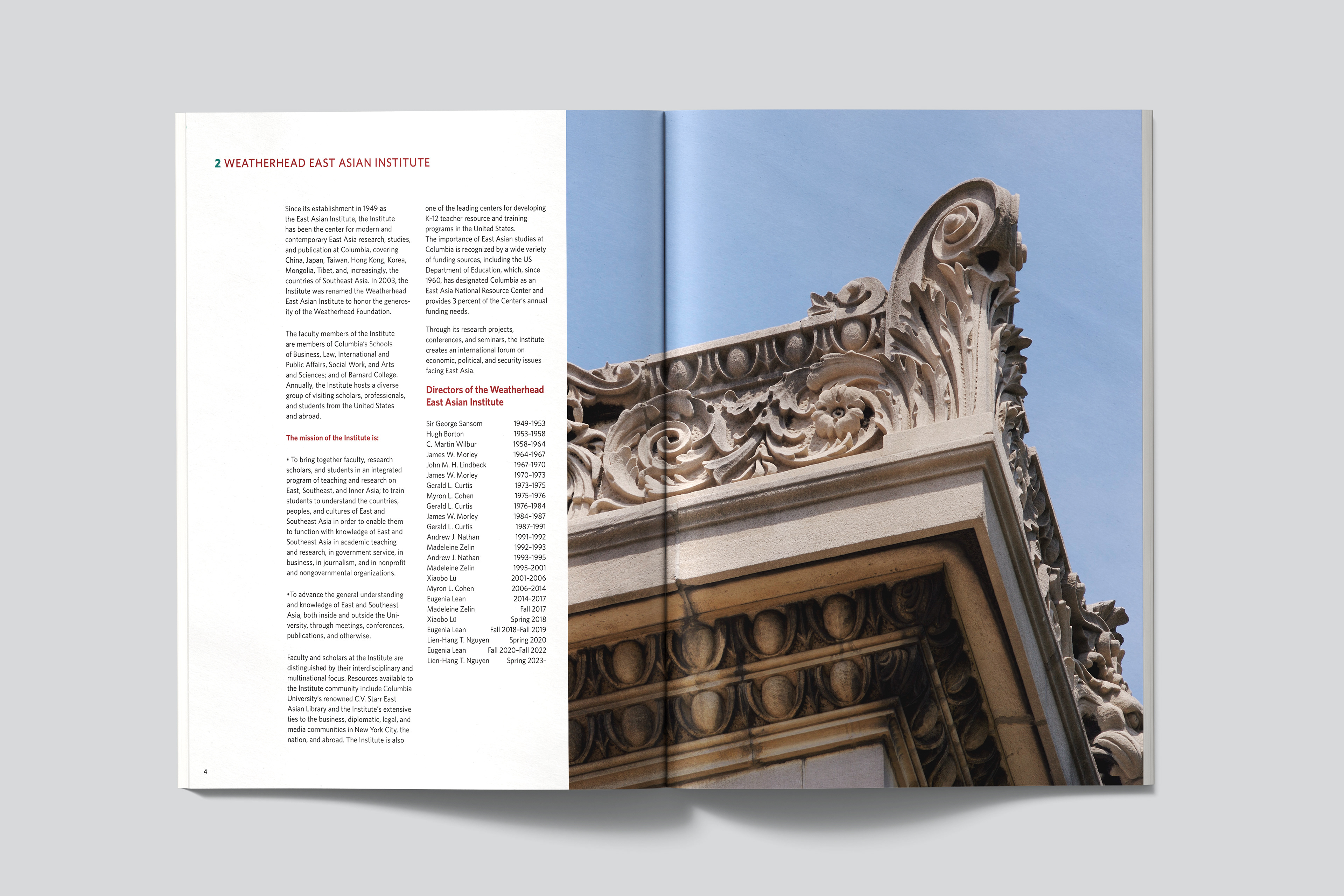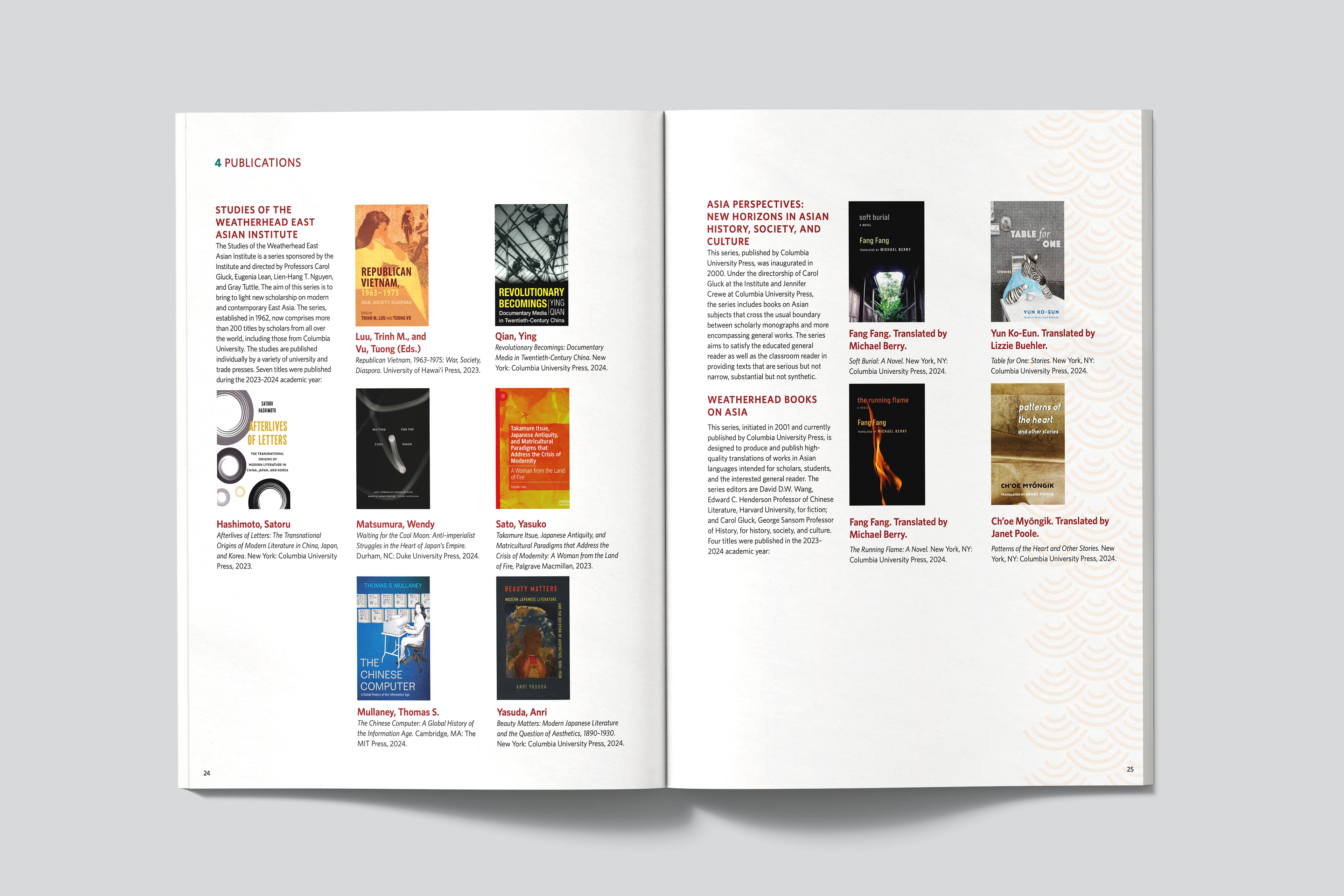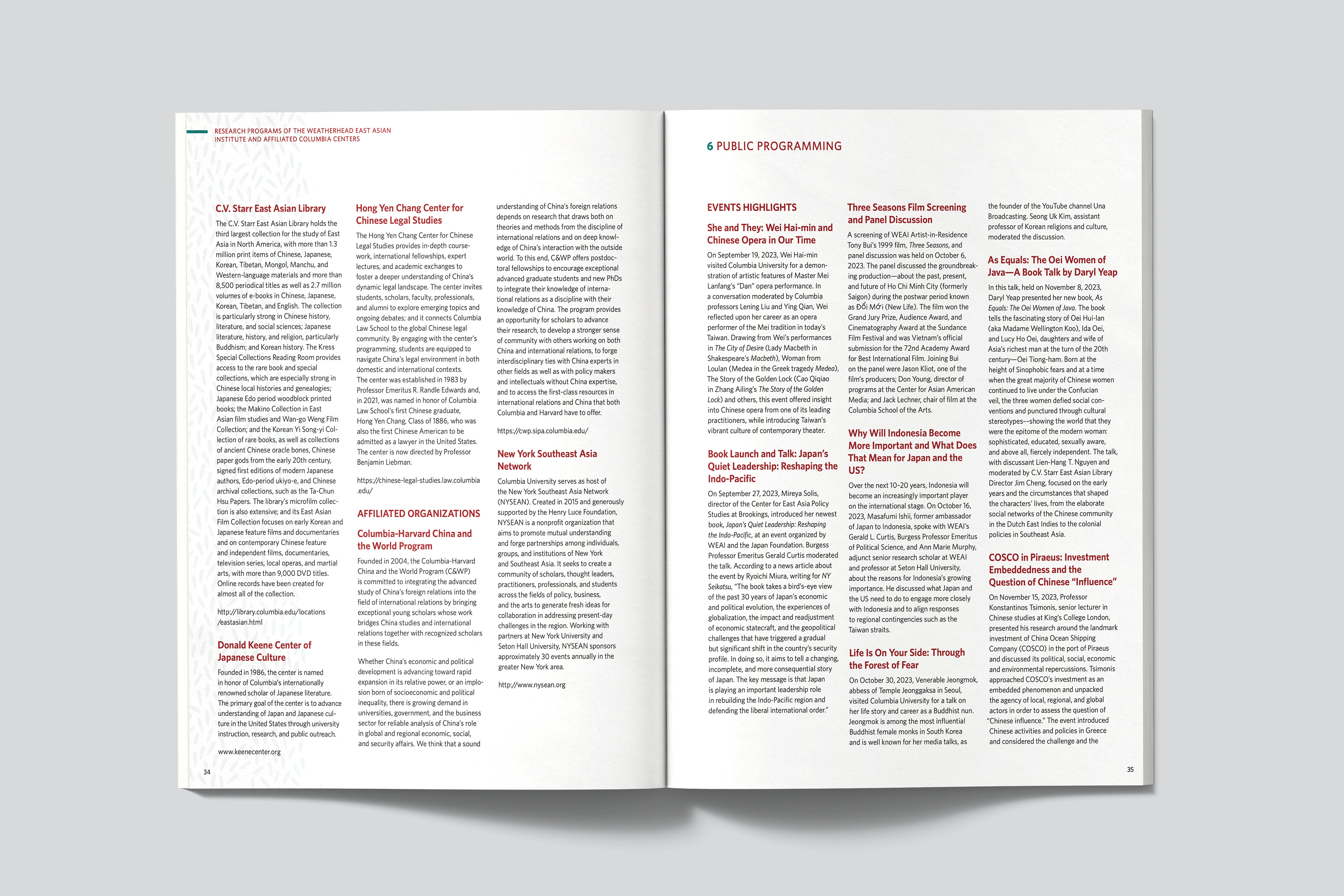 For the past three years, I’ve had the pleasure of designing the Annual Report for the Weatherhead East Asian Institute at Columbia University. The Institute brings together faculty, research scholars, and students from across the university, advancing knowledge and understanding of the region through academic programs, research initiatives, a renowned publications series, and a robust calendar of public events. Each year, these activities and resources culminate in a publication-style Annual Report—typically around 60 pages—which is printed and distributed to affiliates throughout the University.